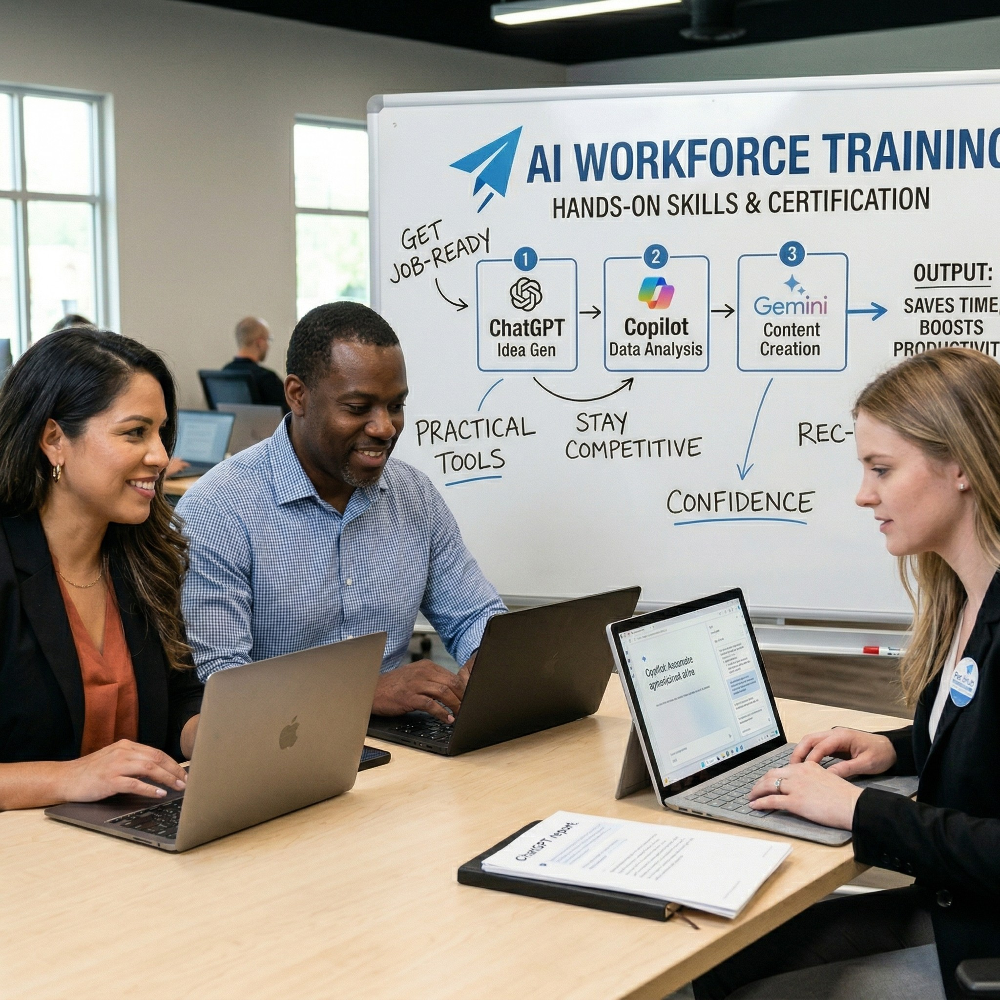 We equip individuals and teams with practical, job-ready AI skills they can use immediately. Our hands-on training cuts through the hype and shows people how to actually use tools like ChatGPT, Copilot, and Gemini to save time, improve productivity, and stay competitive. Whether you’re starting from scratch or leveling up, we turn confusion into confidence fast.